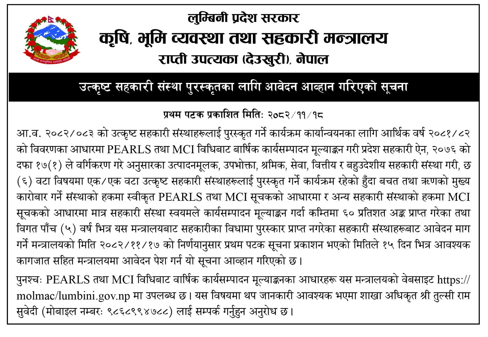 कृषि, भूमि व्यवस्था तथा सहकारी मन्त्रालय राप्ति उपत्यका (देउखुरी) नेपालको उत्कृष्ट सहकारी संस्था पुरस्कृतका लागि आवेदन आव्हान गरेको सूचना ।